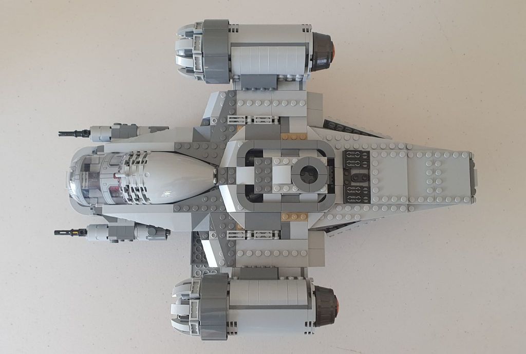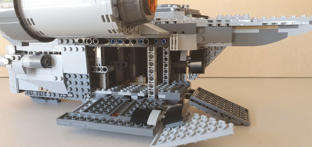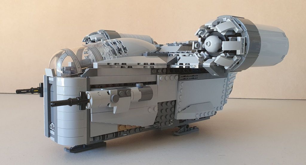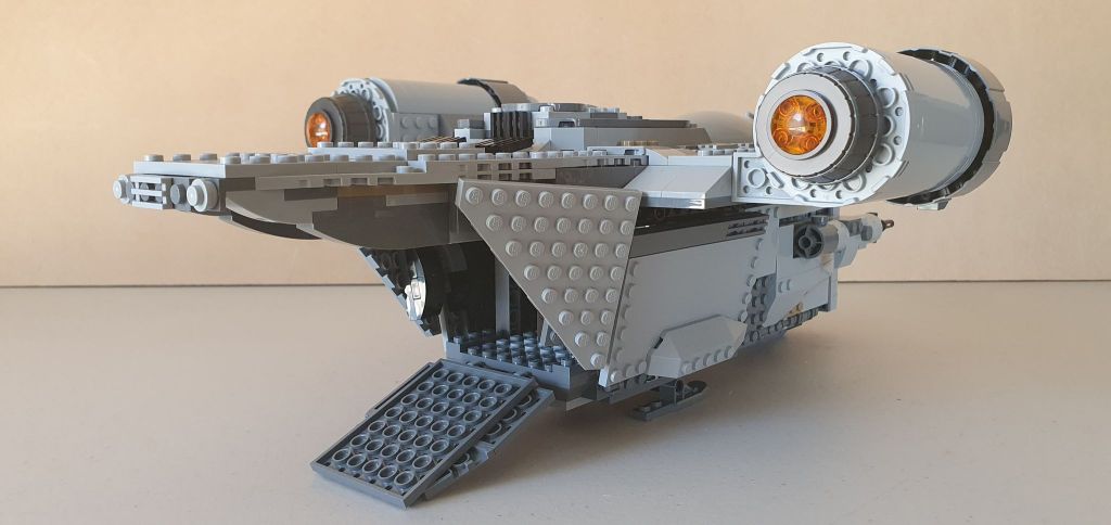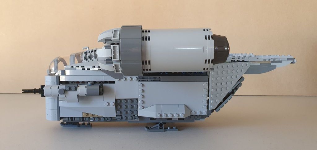The Razor Crest, like a lot of Star Wars vehicles has a technic frame and plate panels using clip and hinge style elements to build the unique shape of the body. The set is a nice, displayable size and the designer has definitely done a good job getting the proportions of the vehicle close for this set.