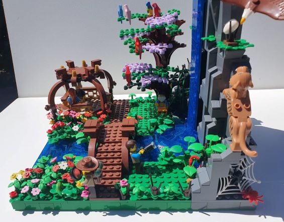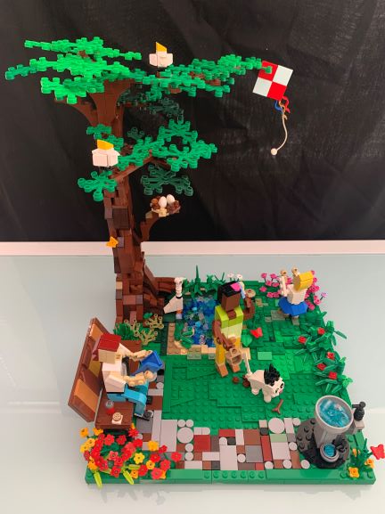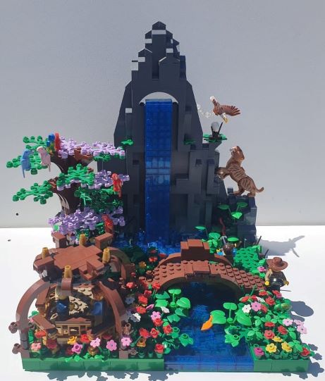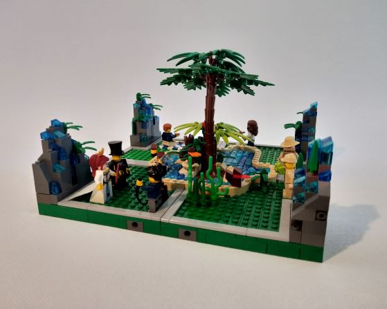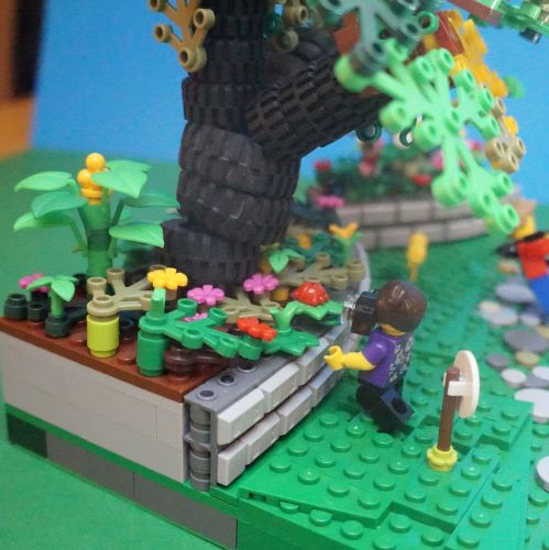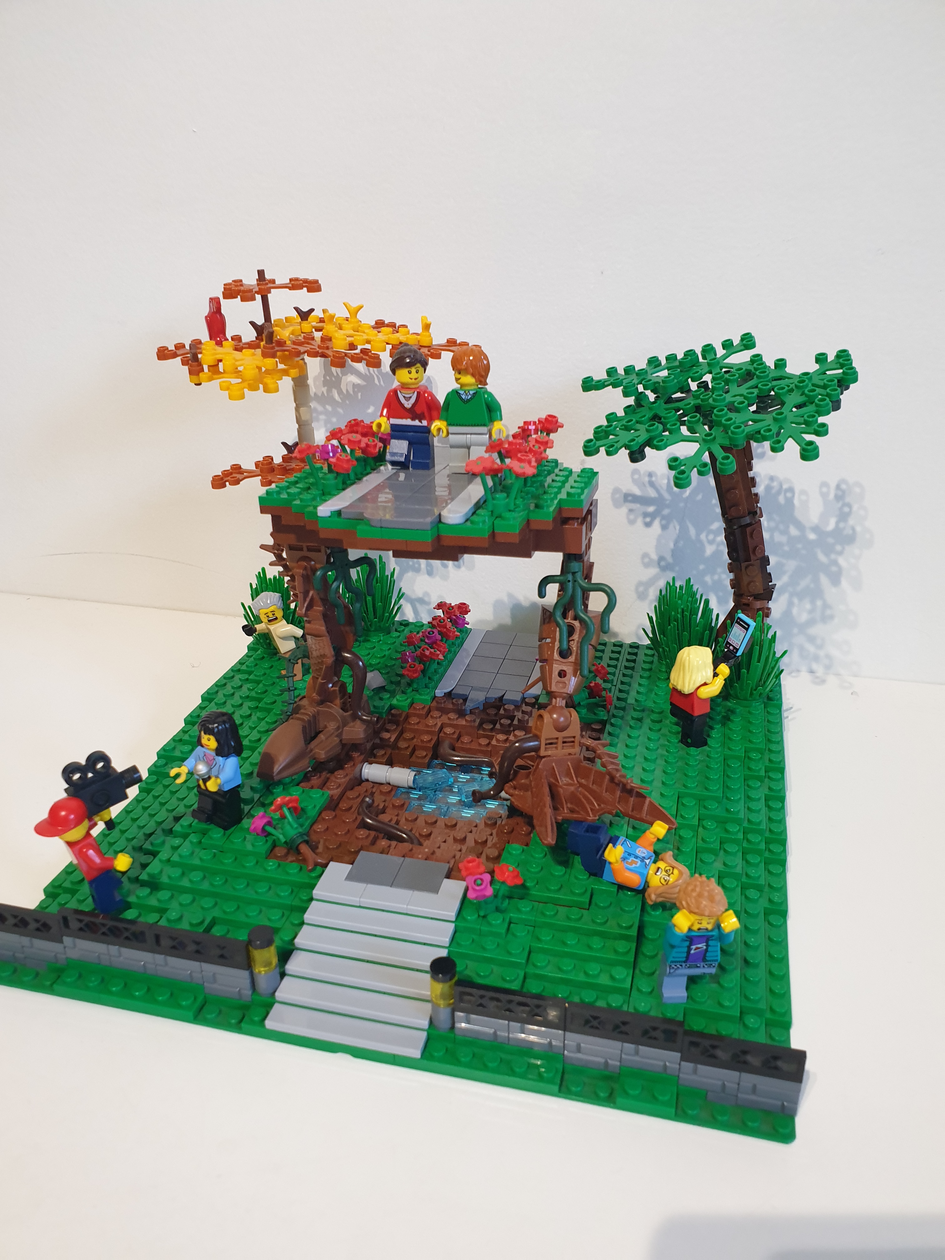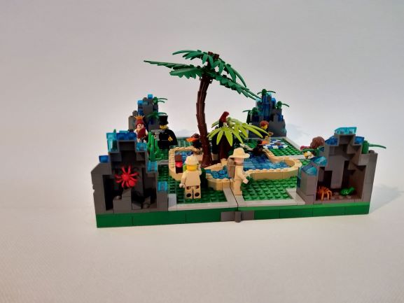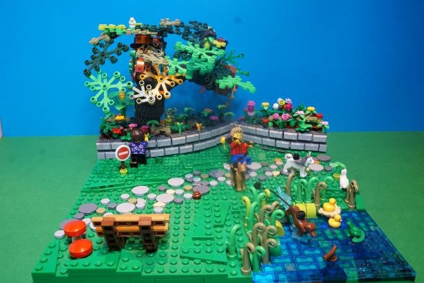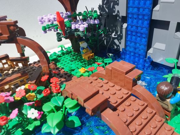 “This one is our family entry, they did most of it, it’s called ‘a walk in a changing park’. Essentially it is a changeable scene, by moving the plates you get different arrangements of the build, it starts with a tropical park with a palm tree and pond/lake in the middle, it then becomes a waterfall feature in the middle with the trees and pond at the corners and edges. We call this technique ‘Tectonick Lego’, just to be punny”
