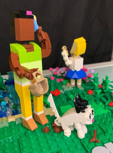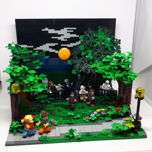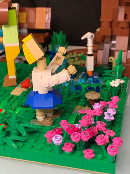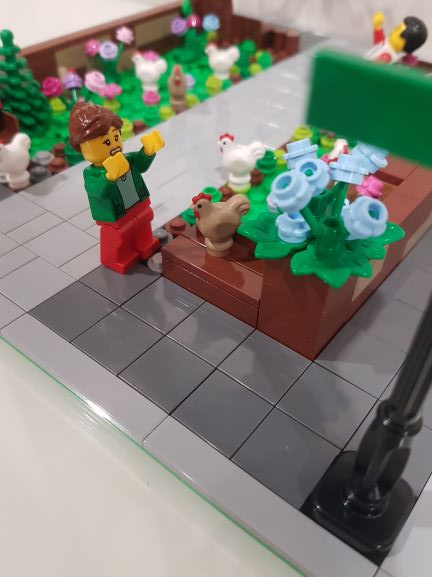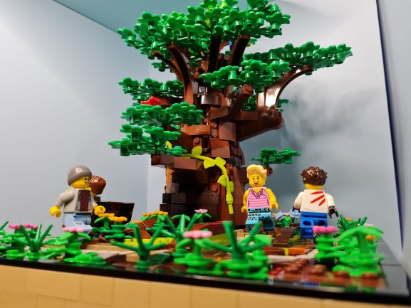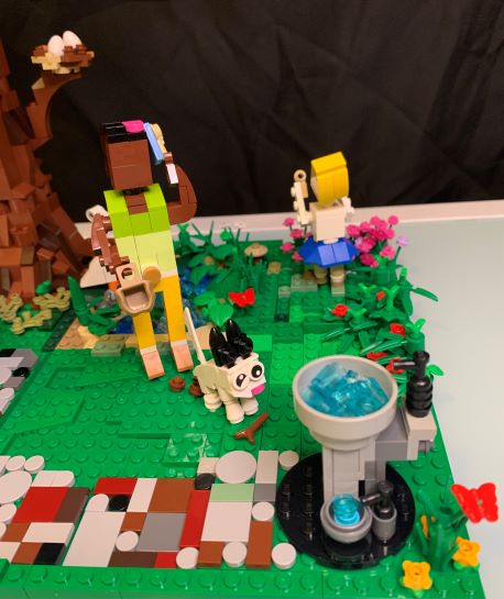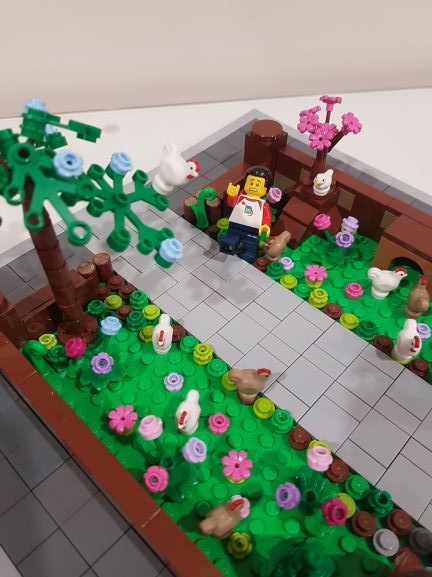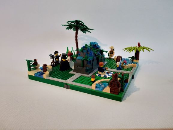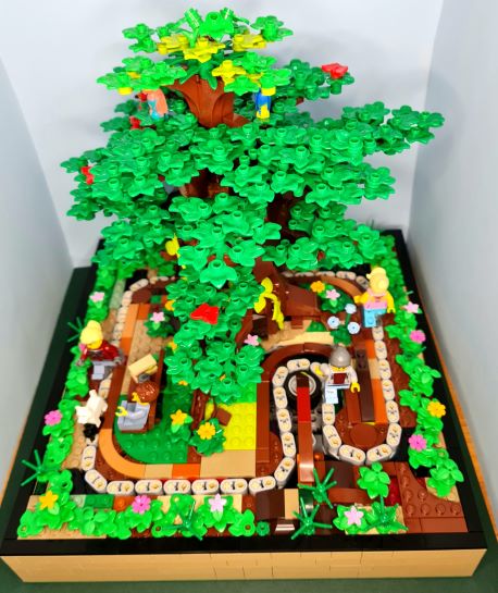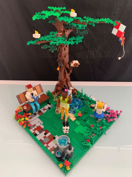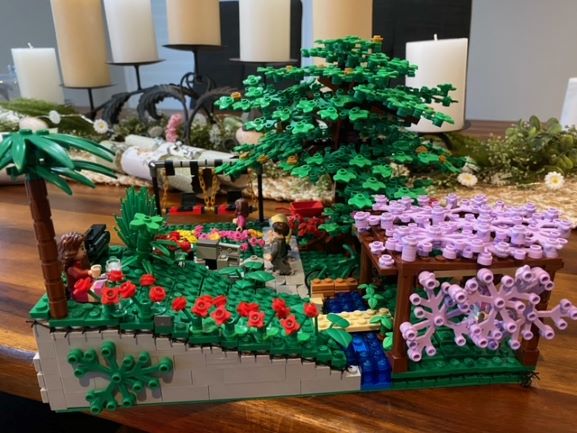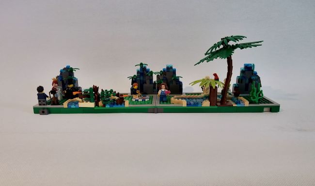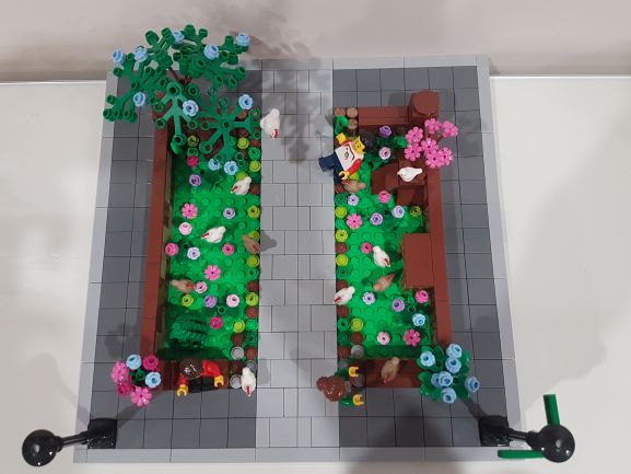 “This one is our family entry, they did most of it, it’s called ‘a walk in a changing park’. Essentially it is a changeable scene, by moving the plates you get different arrangements of the build, it starts with a tropical park with a palm tree and pond/lake in the middle, it then becomes a waterfall feature in the middle with the trees and pond at the corners and edges. We call this technique ‘Tectonick Lego’, just to be punny”