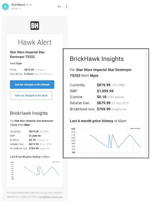 Andrew: “It’s something I came across since the last build night. (I’m sharing this for those who may find it useful, I have no affiliation with them) It’s fantastic at alerting you of out of stock items as soon as they come available. The system searches up to 30 popular LEGO retailers or you can choose which particular ones you prefer. You can also receive alerts for LEGO elements (e.g. individual bricks) from Bricks and Pieces and Pick-a-Brick. If something rare comes back in stock you can be emailed immediately to purchase. You can also set deal alerts so it will only notify you if a particular set you want, or a theme you like, is at a new price and a particular % discounted than the RRP from lego.com.au. For example, say you only want to know of anything 30%+ off. If you see a deal in store or something for sale you can quickly search the history on the website to see what’s the cheapest it has ever been and how this price compares etc. And lots more. I suggest you have a read through the full list of features on the website. brickhawk.com/premium