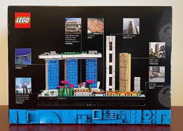 First to note is the new style of packaging. Gone is the previous flip open type box, Singapore is packaged in a larger “thumb” press tabs opening style. While I personally recycle my boxes, this style of packaging may not bode well with box purists. The packaging for Architecture Landmark sets was changed to a black box with white band along the bottom – as seen for Taj Mahal (21056) and the White House (21054). The Singapore Architecture Skyline packaging has been released as a black box with a blue band along the bottom. This may be an indication of the way Lego will market future Architecture packaging – White band for Landmark sets and Blue for Skylines.