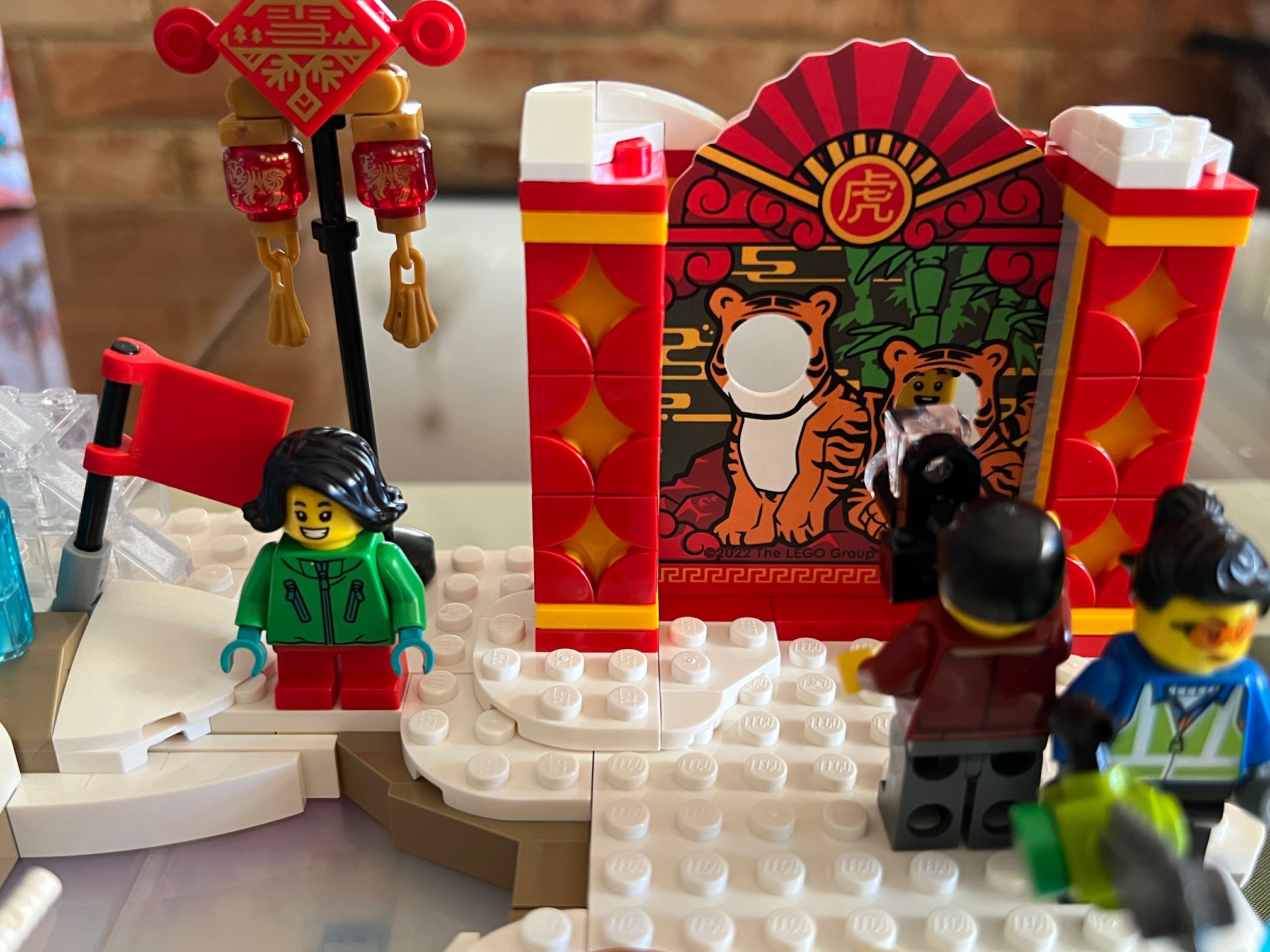 The top part of the gate actually shows the Chinese character for “Spring”, which I found it very clever and pretty. And there is so much going on on the ice rinks to keep everyone entertained. This set even comes with a roasted sweet potatoes cart to keep everyone warm. And look at the new Tiger costume guy, I’m always excited to see what the Chinese Zodiac character looks like when a new set comes out. So far we have already got 4 animals.