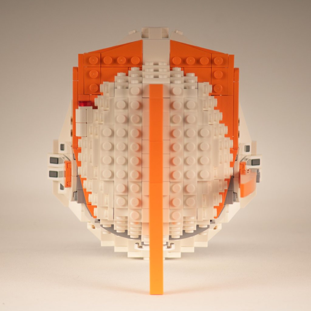 Speaking of form, Cody’s helmet here is the ‘Phase 1’ design seen earlier in The Clone Wars. There are fewer curves, more angles and with the distinctive bright orange visor, fin and antenna, the helmet really is bold and striking perched on its black plinth. The face is also more accurate when compared to Rex, owing largely to those less complex shapes. The mouth isn’t exactly perfect but thankfully extends a few studs wider, further emphasising the already sharp contrast of that black on white. Some surprising attention was paid to the back of the helmet too with the depth and variation in the grey pattern some of the smoothest work on the entire model. If I had to nitpick though, and I do since it’s my job, the chin has some slightly awkward gaps and should be indented from below just a tad. I also find the 1×2 tow ball piece attaching the antenna in light bluish grey to be a little distracting in that colour: be orange like the rest already.