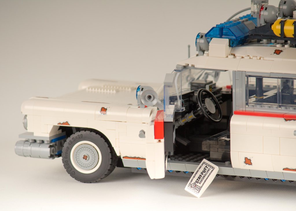 Just like the films, this vehicle is absolutely packed to the gills with everything needed to fight the supernatural. From proton packs and ghost traps to all the little requisite dials and gizmos; clearly the designers were fans and paid attention to the details. I really enjoyed those moments throughout the build where I recognised another piece of equipment or reference. The ‘Stay-Puft’ marshmallows on the front seat certainly elicited more than a smile. And the joy doesn’t stop there; I couldn’t believe how many action features they included. I thought this was more of a shelf-sitter but that assumption couldn’t have been further from the truth. Of course the doors open and the steering wheel works but there’s a rear trap door, swiveling and rotating rooftop antennae and my favourite feature – the door gunner seat. It’s taken more from the Afterlife movie but I like to think in my own head-canon that the original crew added it sometime in the intervening few decades. Open the rear side door, push the hidden bricks on the driver’s side and bam, the back passenger seat flicks out and spins around. Awesome!