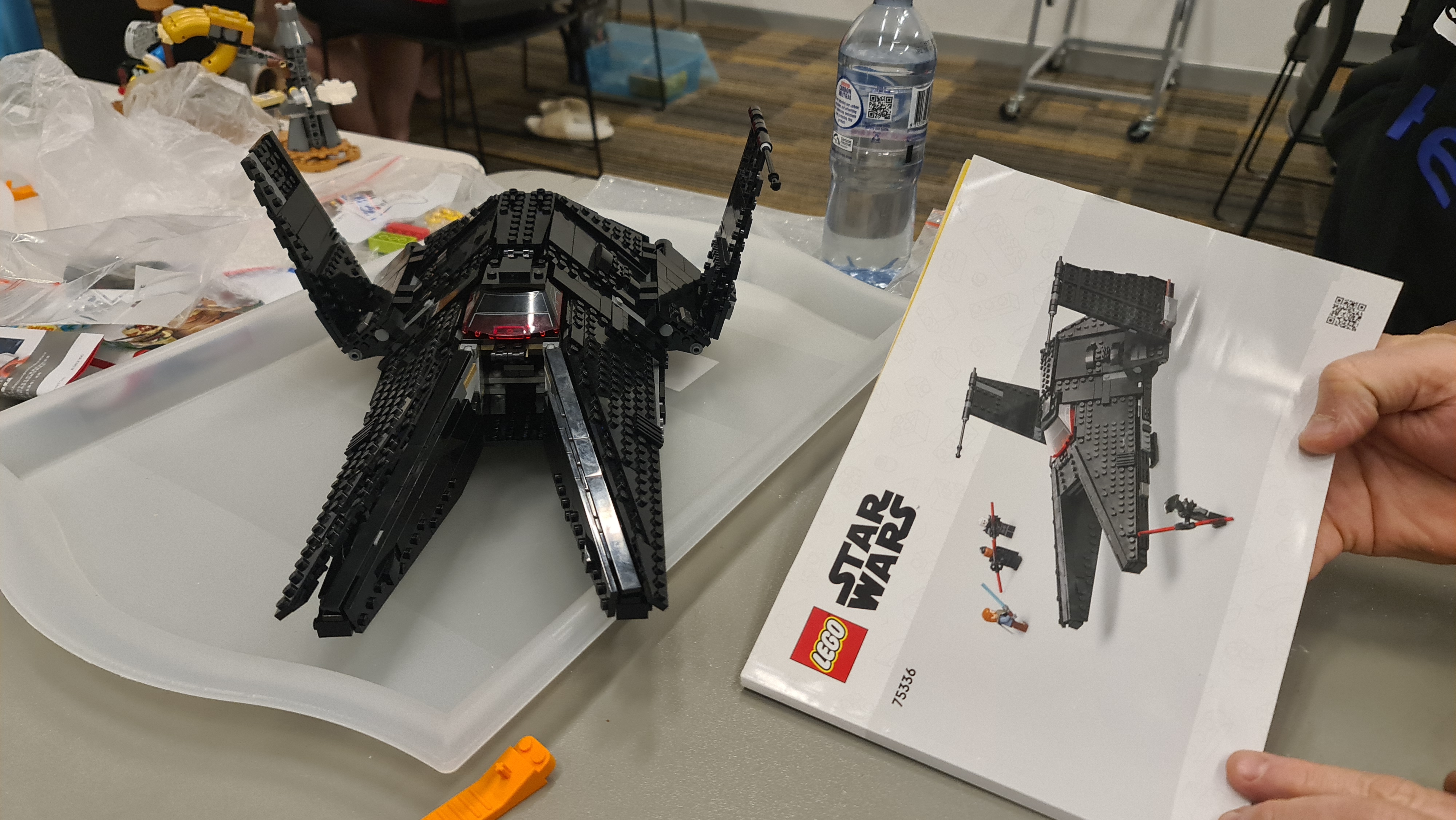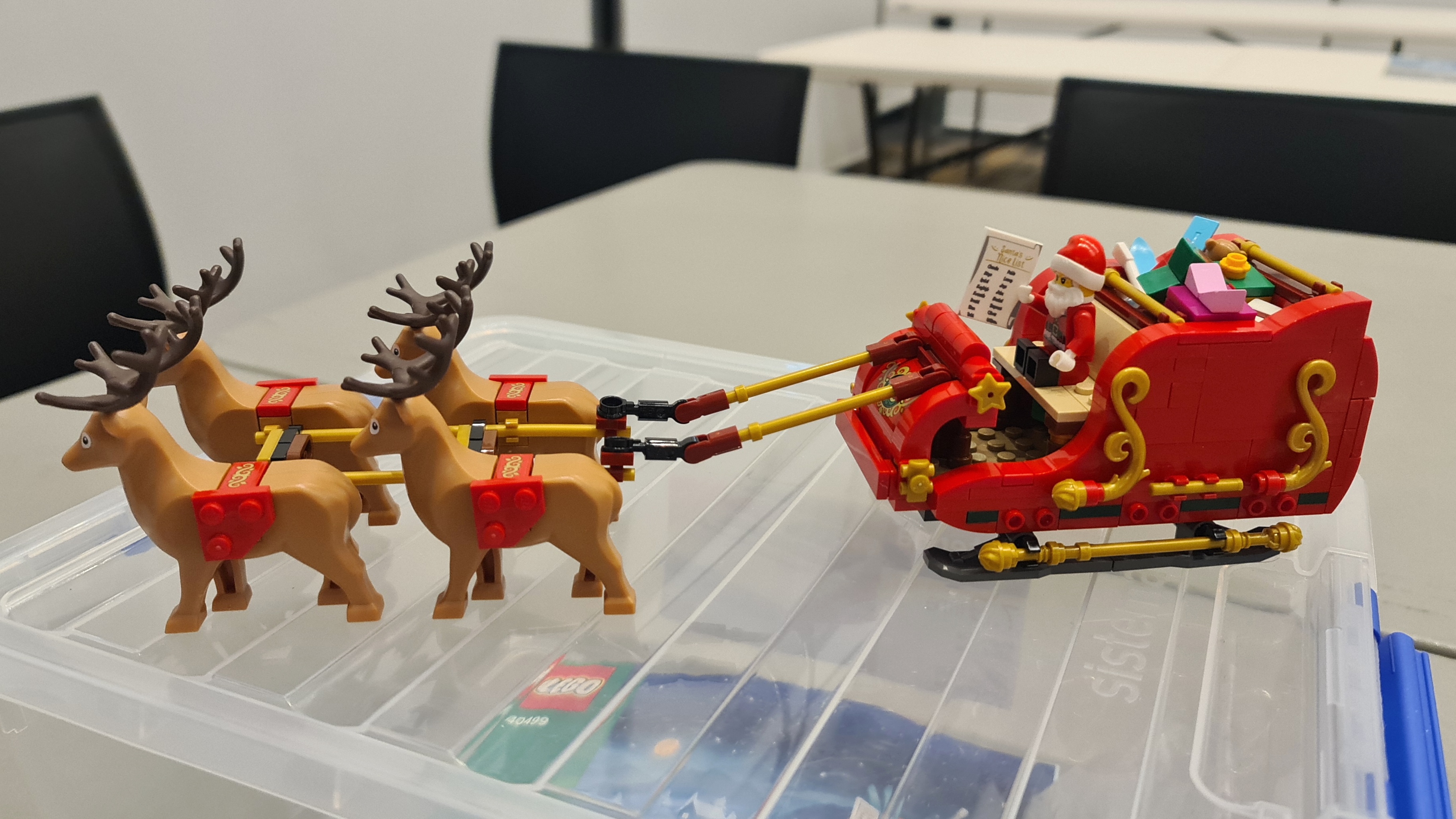 Amongst all this festive fun last night, you may be forgiven for thinking there wasn’t all that much actual, you know, Lego building going on! Some people actually did manage to join a brick or two together and I caught a snap of Helen’s wonderful welcome display and Pam’s delightful Santa Sleigh. From across the room, Peter’s McLaren Formula 1 race car stood out to me – I loved all the functioning details made obvious by this design. Moving on, I noticed Robin nearing the end of the Space Shutte build and likewise, Andreas finishing up what seems to be a rather finicky Star Wars Inquisitor Sycthe starship. There were so many more I missed but so much fun roaming about and seeing what everyone was up to. Thanks for indulging me folks!