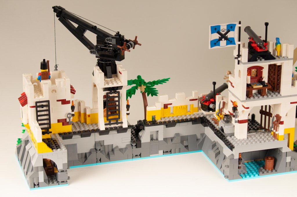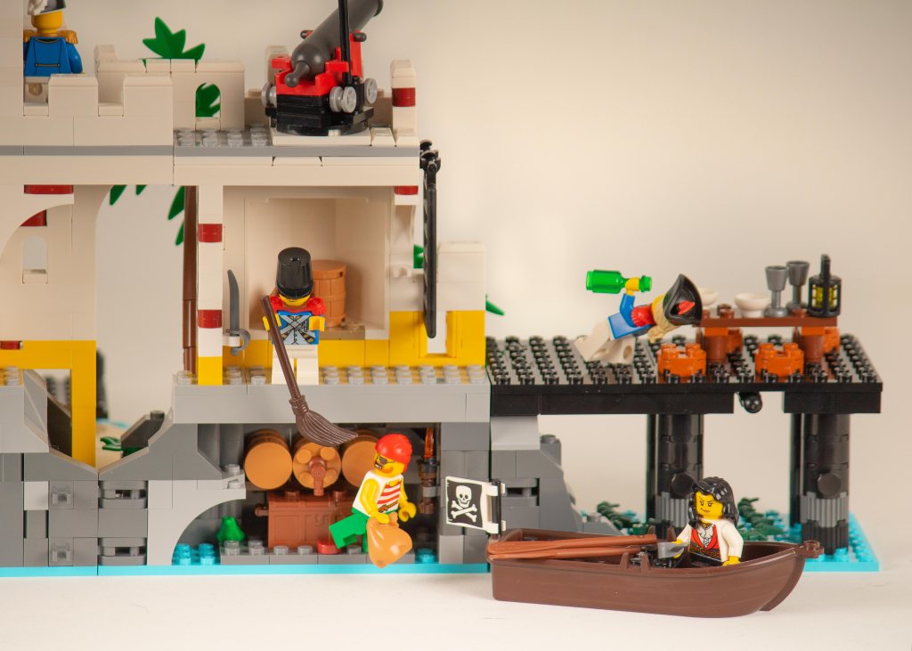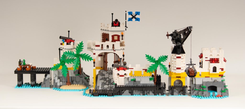 And here, here is where the true gold lies. With the simple snap-on and snap-off of a couple 1×1 clip pieces, the Fortress can be pulled apart into five separate modules. Have them arranged into one single 70cm long display or have a couple smaller island outposts. It’s your choice. I really can’t make up my mind which is my favourite layout but I’m leaning towards the longer setup. Its MOC/mod potential is as obvious as it is enticing. The space is perfect to throw in a 16×32 baseplate or equivalent and extend the scene with your very own module! To be fair, it does look a little empty without that something extra but I see it as more of an opportunity than a shortcoming. Now have a larger pirate ship like the Creator 3-in-1 (31109) dock alongside and you might just have the best pirates display money can buy out of the box.