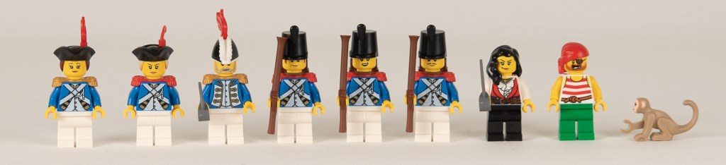 With eight minifigures; six imperials and two pirates, you have plenty to work with to create the perfect salty scene. Two have dual faces and the hair-hat combo pieces are very much appreciated. Have soldiers man the cannons and don’t let those scurvy pirates escape with the sloop! (is that what the little pirate ship is called ye folk of the sea??) Oh, and there’s a crab, parrot and monkey to fill out your crew. Not too shabby.