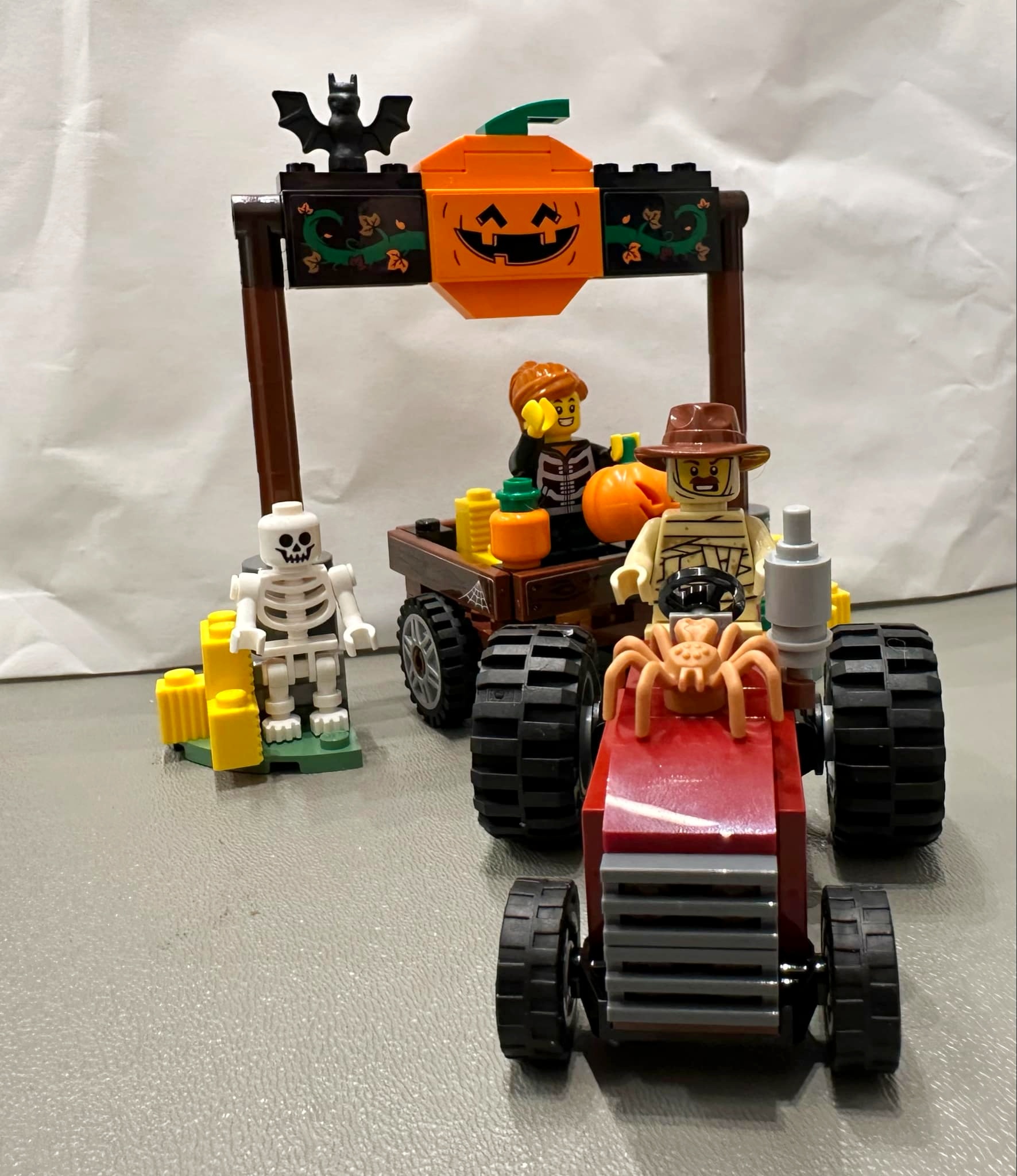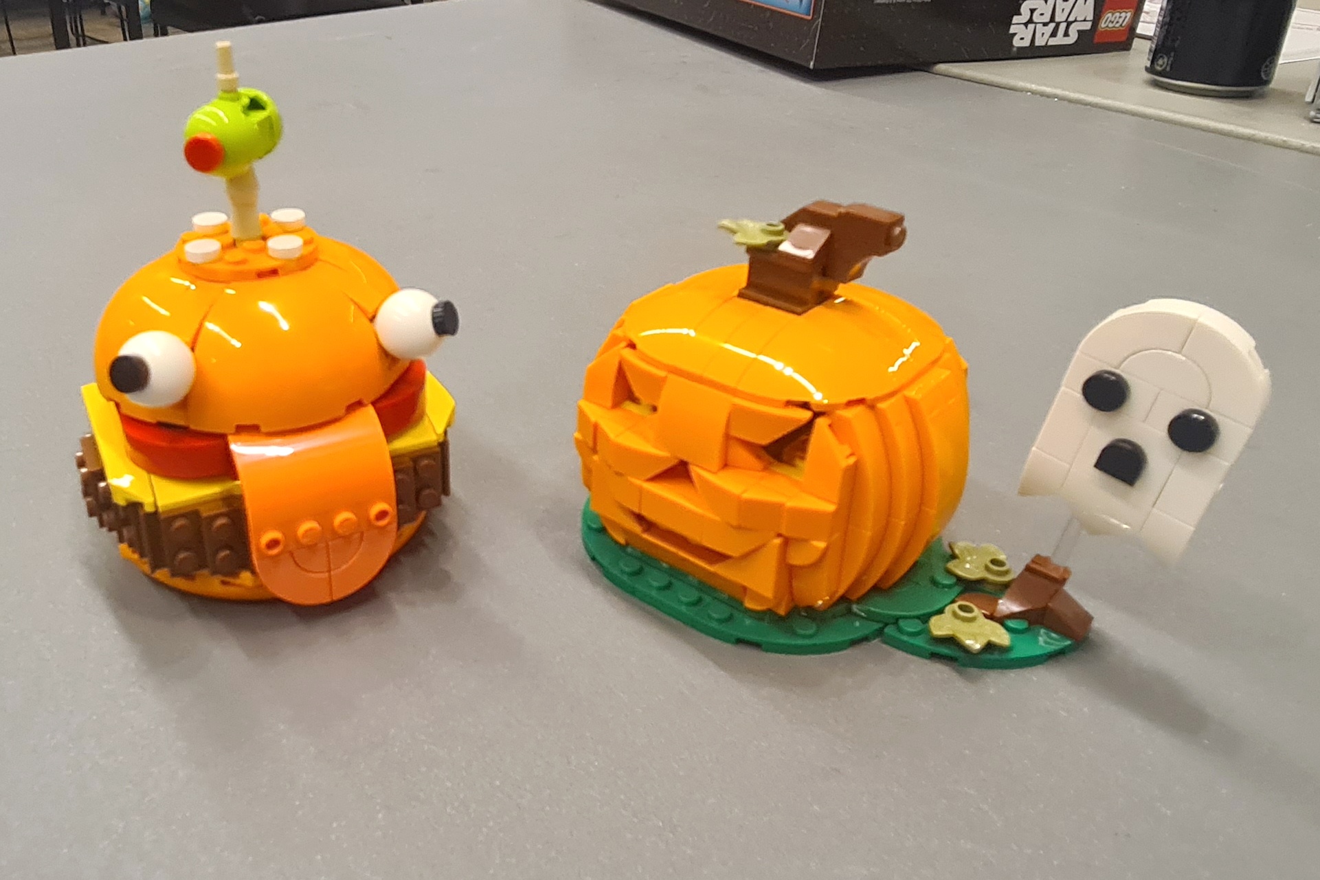 Now for my favourite part – shoving my nose into all the wonderful sets being built at Buildapalooza! This month there was a definite Halloween flavour with a new Lego Gift-with-Purchase dropping just last week. Bek was one among a few with the new Light Up Jack-o’-Lantern GWP alongside what I’ve been reliably told is a ‘Durr Burger’ – I think it’s from some little indie video game called ‘Fortnite’… On theme too was Judy with her Wednesday & Enid Brickheadz – cute! And of course, it wouldn’t be an October build night without Krista bringing along a Halloween set. This one is the adorable little Halloween Hayride set.